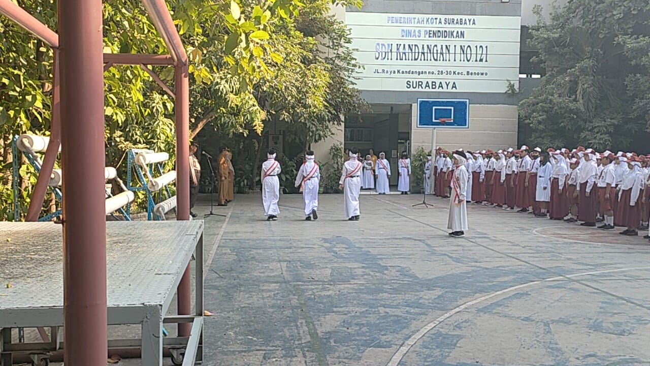 Kanit Binmas Polsek Benowo Iptu Sukardi menjadi Pembina Upacara pada pelaksanaan upacara bendera di SDN Kandangan I Benowo Surabaya, Senin (16/10/2023). Kegiatan